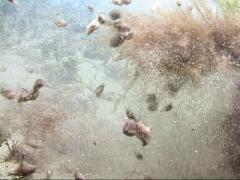 In shallower waters 25 feet or less, some Halimeda plants were thick and gray with sea hares. 54K JPEG |