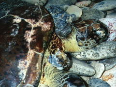 Through a large sighting network of divers and snorkelers, the juvenile populations have been monitored continuously for six months. More detailed information was collected through direct observations on several "turtle hotspots" around the island. Also included in the 1995 project was a photo-identification trial. The goal was to identify individual sea turtles by means of taking slides of juvenile sea turtles at a fixed location throughout the project. The location chosen was the reef in front of Lac Bay. At daytime, an estimated amount of over 30 green turtles and a few hawksbill turtles reside along this reef. The thought is that the green turtles (both juveniles and subadults) reside here all year round, migrating in to Lac Bay at night in order to forage in the sea grass beds.