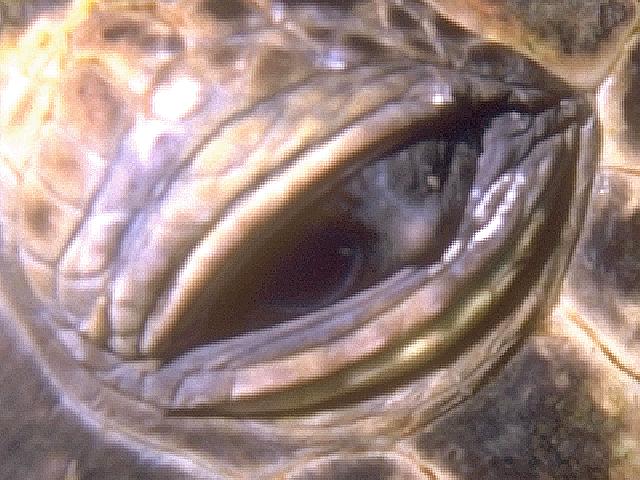 Left eye, 1995 Turtle 24: Nani (64K JPEG)This is the best example we have of early tumor growth. This turtle also has the salt and pepper spotting that we normally see develop into tumors.