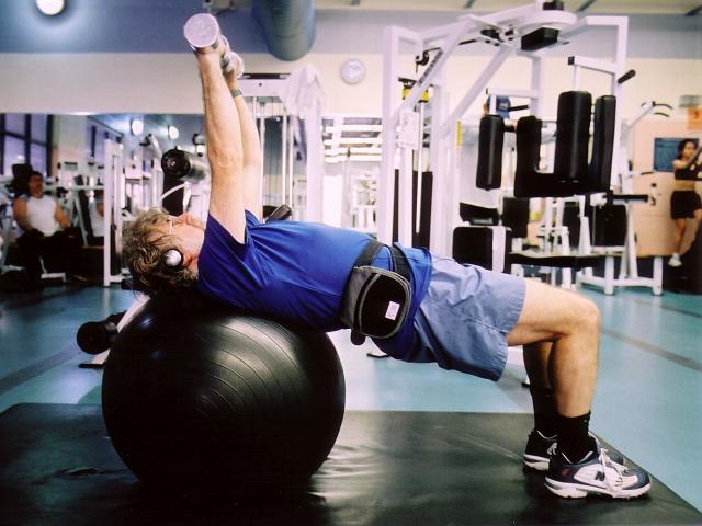 Peter implements lessons passed on from Janet: chest presses on the stability ball! 47K JPEG |