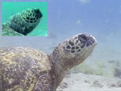 It was Shredder, and Peter stopped to admire her as she calmly lifted for air. It was wonderful to see her again, but there is bad news. Shredder has a small tumor growing in each of her eyes. This wonderful old female now has fibropapilloma disease.