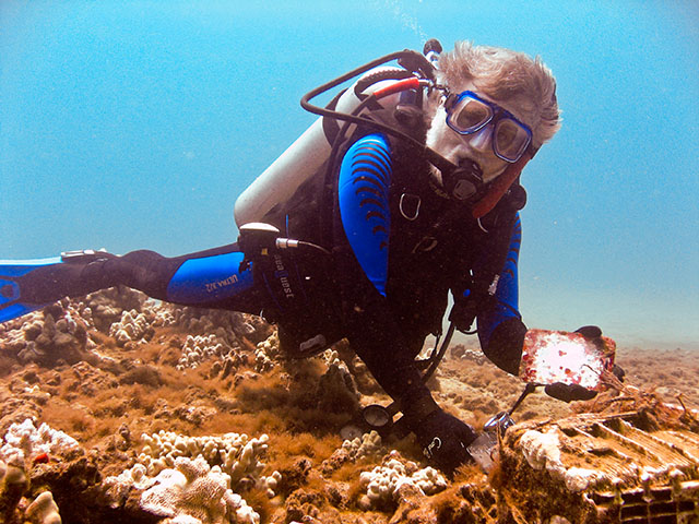 The book begins with a promise to Clothahump: to tell her story and the story of the honu on her reef. At the end of 2002, after I’d had my angina scare and we realized that time could run out without warning, we renewed that promise by placing it on a dive slate underwater at Reef 2, near the honu. This week, on our aloha dive, I went back to that slate to pose for a fulfillment picture: thanks to UHP, we’ve kept our promise.