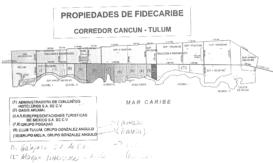 La Jornada April 24, 1998The coast of Quintana Roo between Cancun and Tulum, the Mayan Riviera, was selected in the seventies for a tourist expansion "the dream of the bankers"--Cancun style--massive, hospitality for the bearers of dollars, predators and destroyers; in the hands of foreign corporations. Fidecaribe, under state jurisdiction since 1993, has already sold 323 hectares (including 26 kilometers of beach front between Playa Aventuras and Chemuyil) to two Mexican corporations and two Spanish corporations. This business transaction has resulted in the revenue of 20 million dollars to date for the government of Mario Villanueva, according to information given to La Jordana by Jose Luis Perez Quintal, director of Fidecaribe. However, it was not declared what the total would be for the sale of the four parts of X’cacel/X’caeclito.